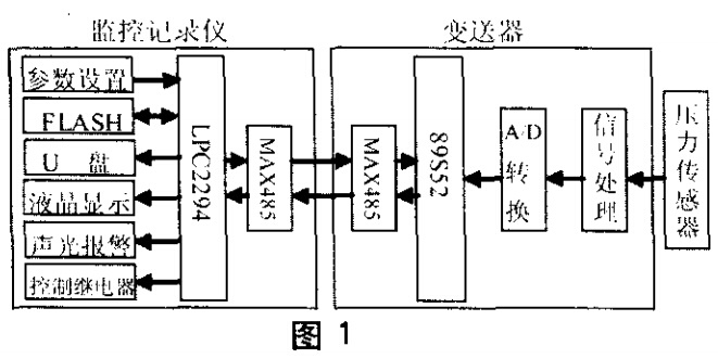 本安全監(jiān)控儀由兩個部分組成:一個與傳感器相連,用于采集重量的前端變送器;一個用于參數(shù)修改設置和數(shù)據(jù)存儲管理的監(jiān)控記錄儀。變送器的功能是將從傳感器過來的模擬電壓轉換為對應的重量數(shù)據(jù)并即時通過電纜傳送到監(jiān)控記錄儀;監(jiān)控記錄儀將從變送器傳送來的重量實時顯示在液晶屏上,同時對吊車的載重狀態(tài)(過載或報警)做出判斷,并輸出相應動作。兩機由四芯屏蔽電纜連接,用MAX485進行數(shù)字通信。這樣就解決了模擬信號傳送易受干擾的問題。系統(tǒng)硬件結構框圖如圖l所示。